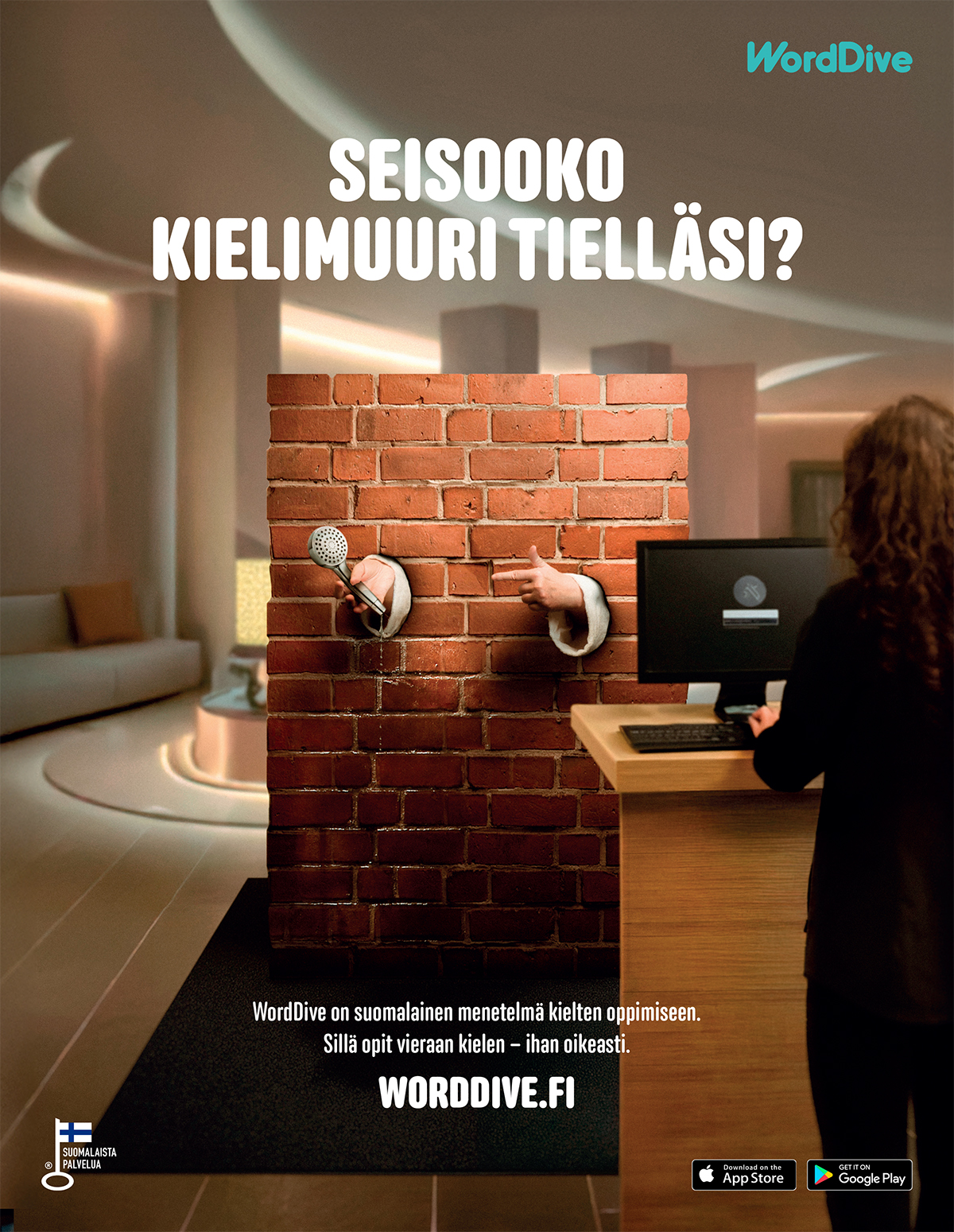 Toisen kunniamaininnan kisassa sai kieltenoppimissovellus WordDive, joka kehottaa kipuamaan kielimuurin yli. Tiilistä kasattu kielimuuri konkretisoi, miten iso henkilökohtainen este kielitaidottomuus voi olla ja kuinka se voi pidätellä ihmistä tavoittelemasta omia unelmiaan.