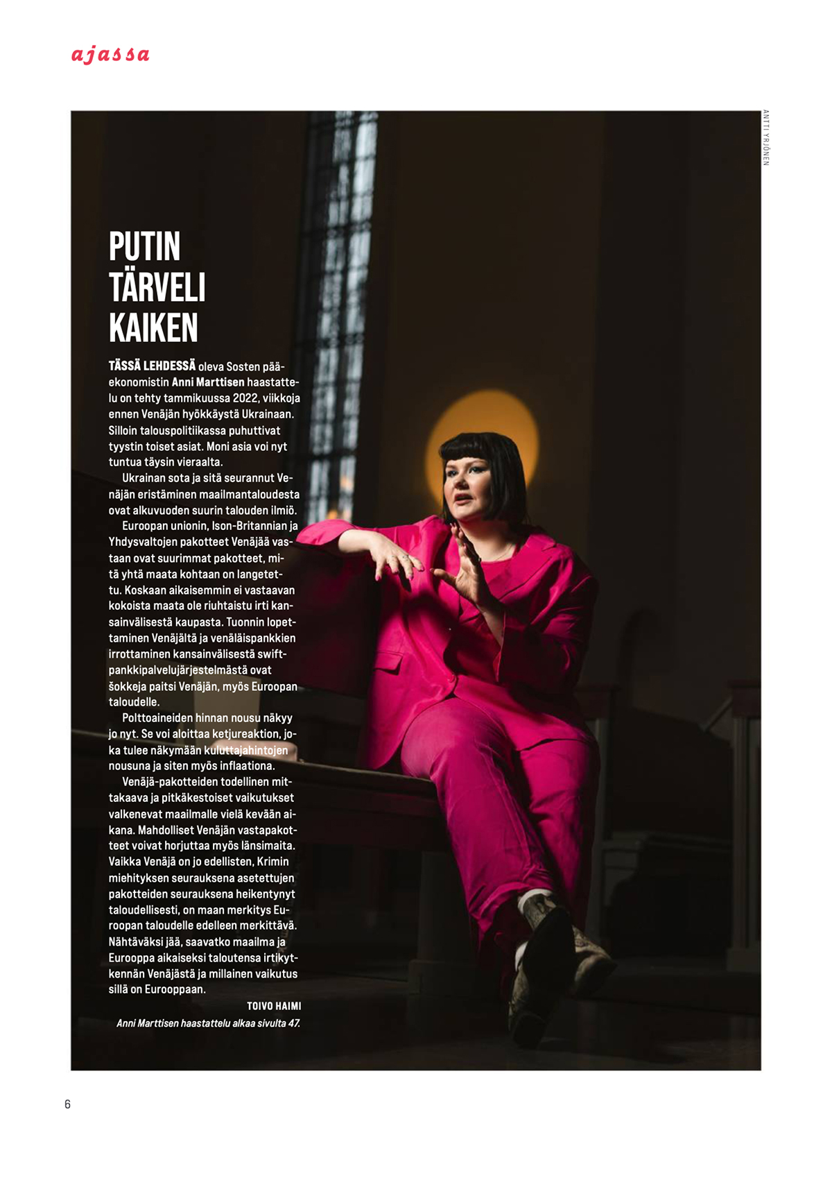 – Kuvasin ekonomisti Anni Marttisen Paavalinkirkossa, jossa rakensin hänestä pyhimyksen. Kirkko valikoitui kuvauspaikaksi, sillä taloustiedettä syytetään toisinaan dogmaattisuudesta ja sitä verrataan uskontoon, hän sanoo.