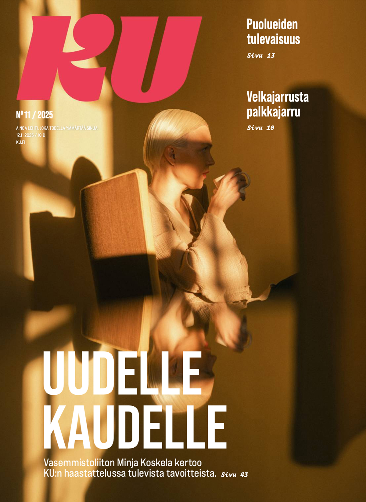 Yrjönen kuvasi Minja Koskelan Kansan Uutisten kanteen Eduskuntatalon keltaisessa huoneessa. Upeaa valoa ei voinut etukäteen suunnitella.
