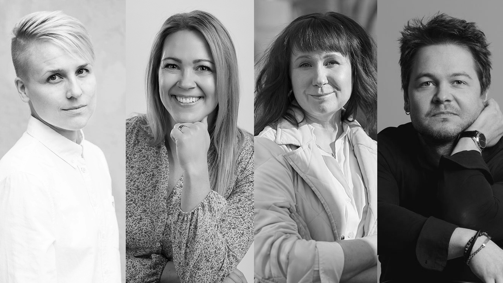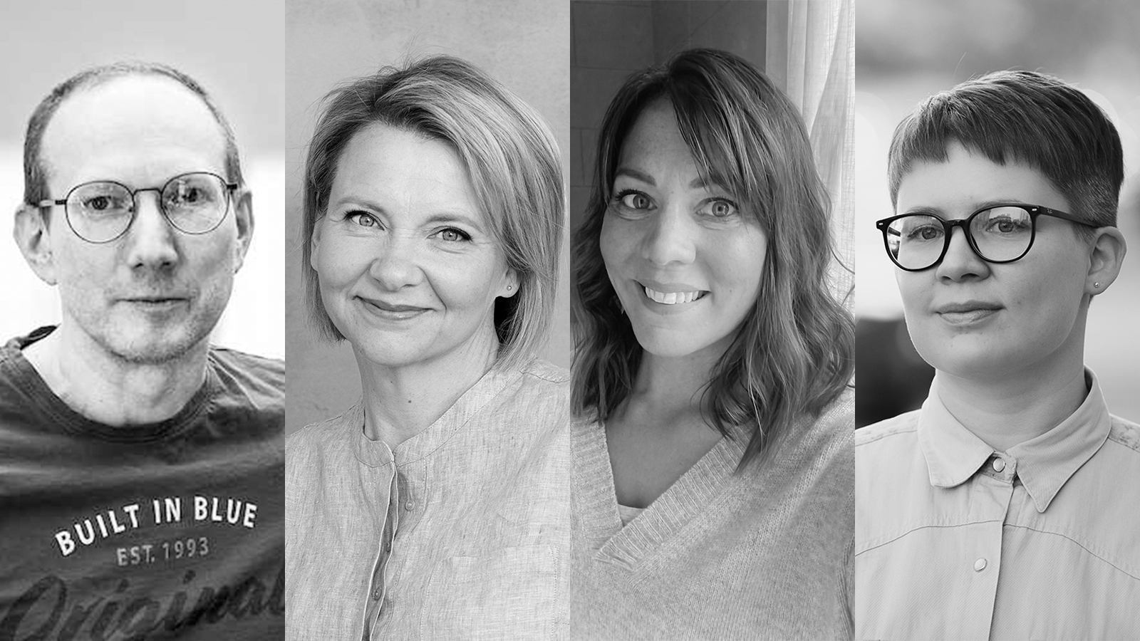 Vuoden parhaan lifestylejutun valitsevat Suvi Rüster, Leeni Hoimela, Valtteri Väkevä ja Meri Brjön. Kuvat: Elvi Rista, Piia Arnould, Jirina Alanko ja Robert Sundman.