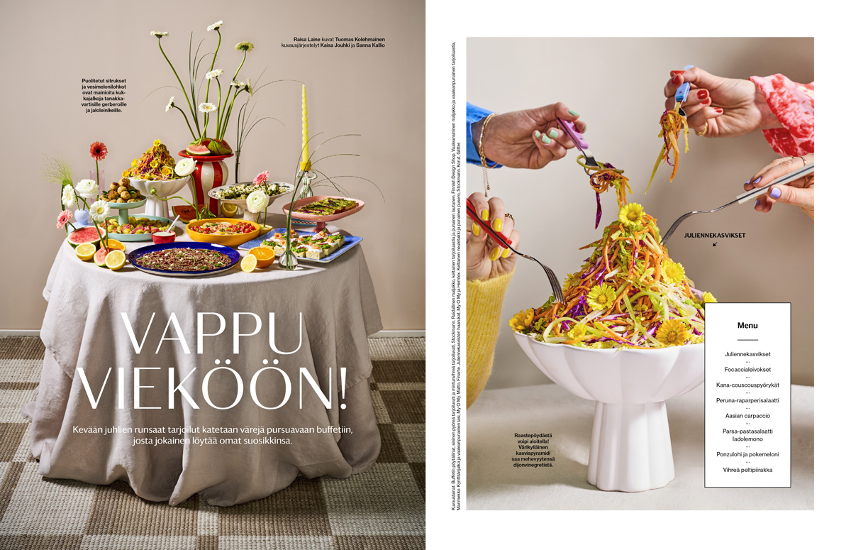 Vuosittain toistuva tarinallinen teema on toteutettu toimitukselle uudenlaisella visuaalisella kerronnalla. Ruokakuvia ei ole otettu perinteisesti miljöössä, vaan tarinallisuus rakentuu erilaisista lähikuvista. Juttu yhdistelee perinteistä ruokakuvaa muotikuvauksesta ja sisustuslehdestä tuttuun tyyliin. Kuvista välittyy rento ja iloinen juhlatunnelma.