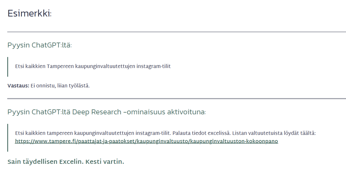 Siinä tapauksessa on syytä miettiä, mitä yritit tekoälyllä tehdä. Voisiko tehtävää pilkkoa? Voisiko tekoälylle antaa tarkemmat ohjeet? Entä auttaisiko joku tietty ominaisuus, kuten esimerkiksi Deep Research? Deep Research on Chat GPT:n syvätutkimus-työkalu, jolla voi tehdä perusteellista tiedonhakua ja luoda siitä analyysin.