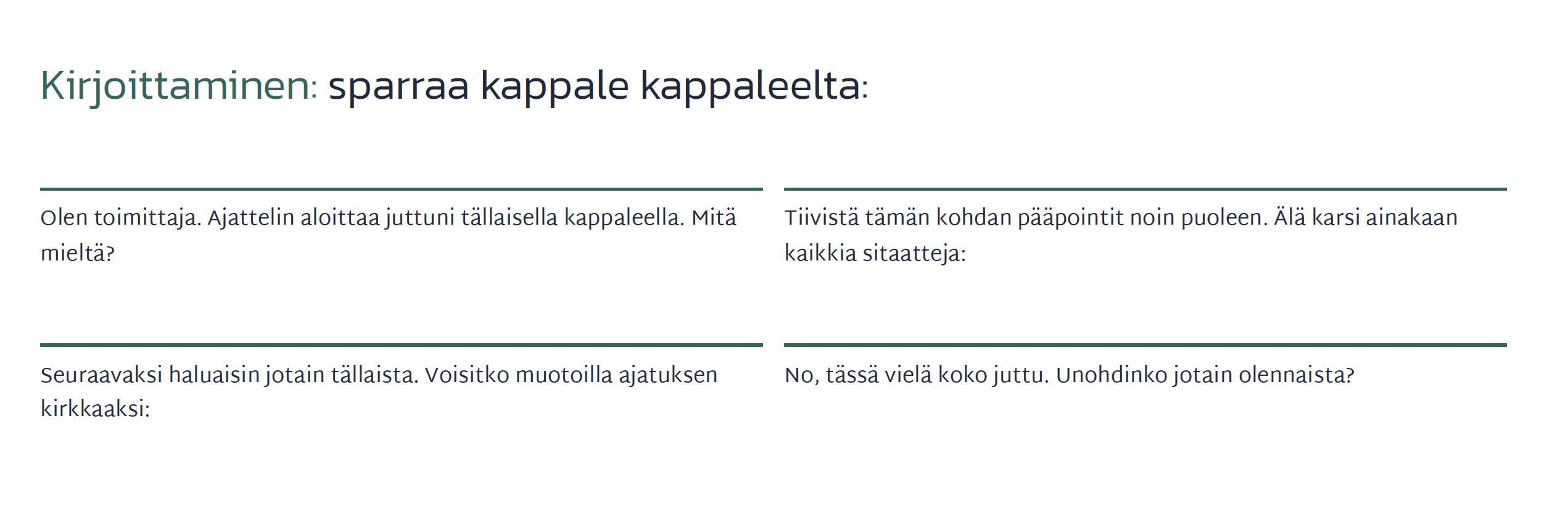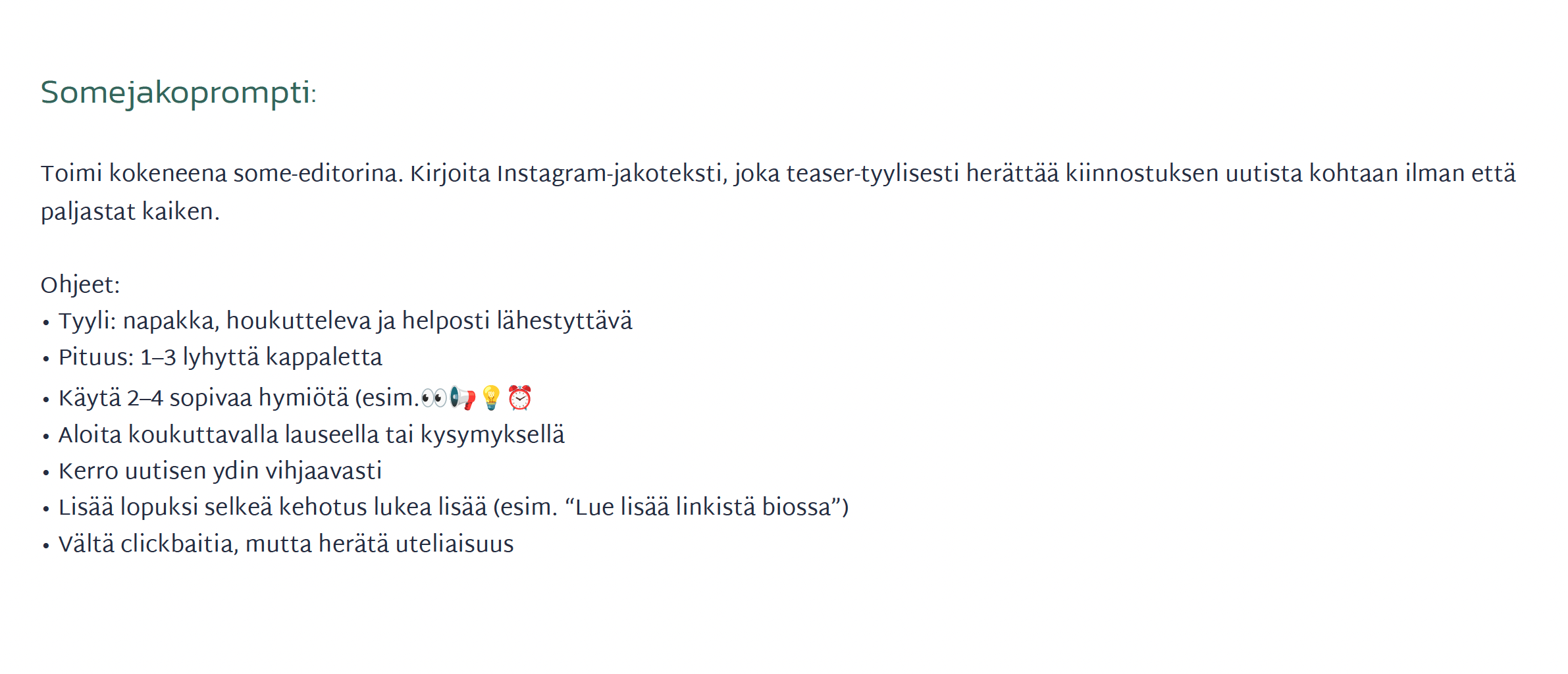 – Kannattaa muistaa, että tekoäly voi aina hallusinoinda, vaikka samaa promptia olisi käytetty onnistuneesti 99 kertaa aiemmin. Kaikki tekoälyn tuottama materiaali pitää tarkistaa, koska toimittaja on viime kädessä vastuussa jokaisesta sanasta.